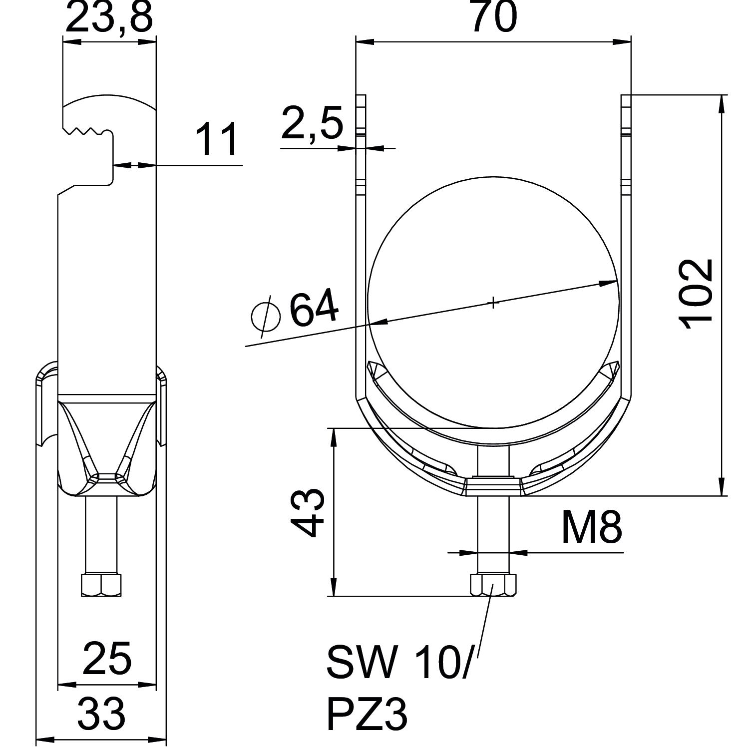 Beugelklem met F-voet, metalen drukwand met afgeronde randen voor kabelbescherming. voor verticale en horizontale montage van 1 afzonderlijke kabel aan vlakijzer. Met enkelvoudige schroef op drukwand, universele zeskantschroefkop SW10, met gleuf en kruiskop. Geschikt voor de montage binnen en buiten. Het gebruik van de tegenwand wordt geadviseerd.