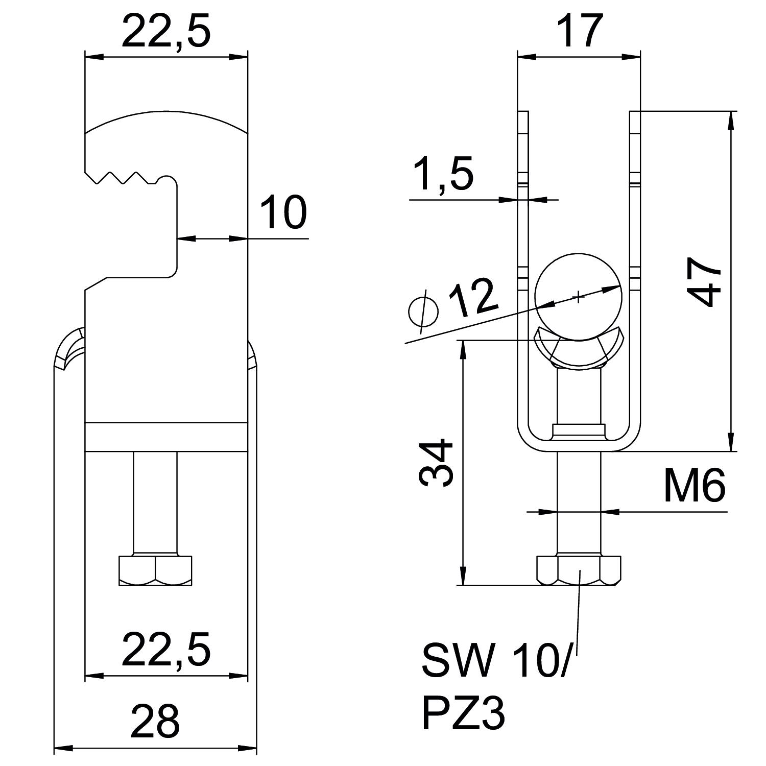 Beugelklem met F-voet, metalen drukwand met afgeronde randen voor kabelbescherming. voor verticale en horizontale montage van 1 afzonderlijke kabel aan vlakijzer. Met enkelvoudige schroef op drukwand, universele zeskantschroefkop SW10, met gleuf en kruiskop. Geschikt voor de montage binnen en buiten. Het gebruik van de tegenwand wordt geadviseerd.